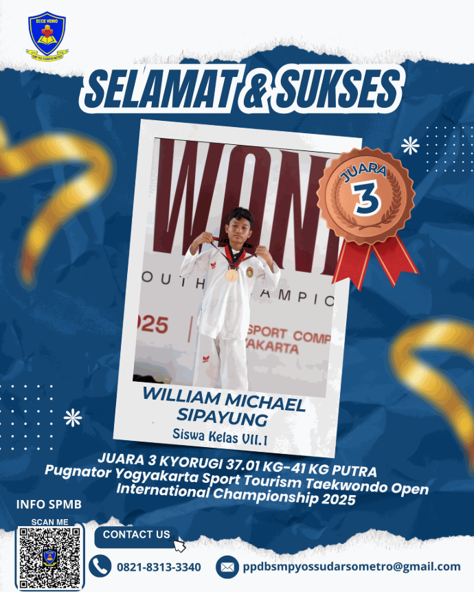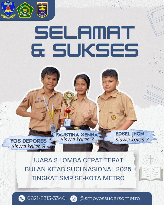 Siswi atas nama Dea berhasil menyabet Juara 2 Festival Lomba Seni dan Sastra Siswa Nasional (FLS3N) cabang lomba Menyanyi Solo Putri tingkat Kota Metro tahun 2025. Prestasi Gemilang!! Semoga akan selalu memberikan motivasi bagi seluruh siswa dan siswi SMP Yos Sudarso Metro