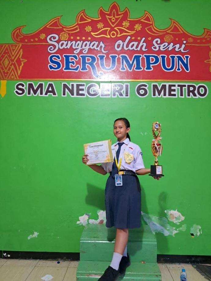 Rahel berhasil meraih Juara 3 dalam ajang Olimpiade Matematika tingkat Kota Metro tahun 2024 di SMP Negeri 6 Metro. Foto ini diabadikan sesaat setelah penyerahan piala dan piagam penghargaan.