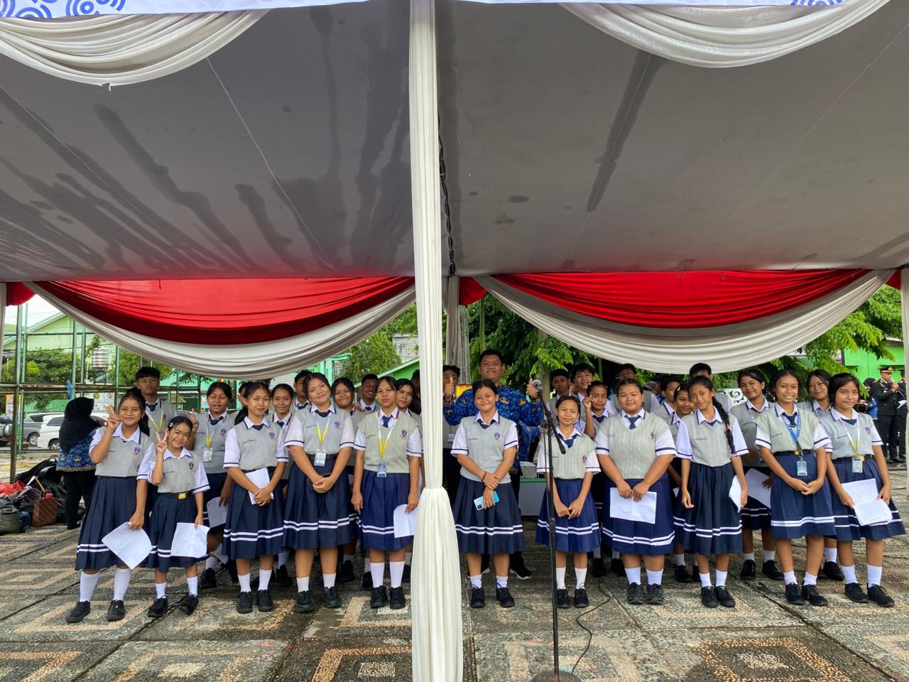 Dengan mengenakan seragam kebanggaan sekolah, para anggota Paduan Suara SMP Yos Sudarso Metro tampil prima di hadapan seluruh peserta upacara, yang terdiri dari jajaran pejabat daerah, TNI/Polri, ASN, pelajar, dan berbagai elemen masyarakat.