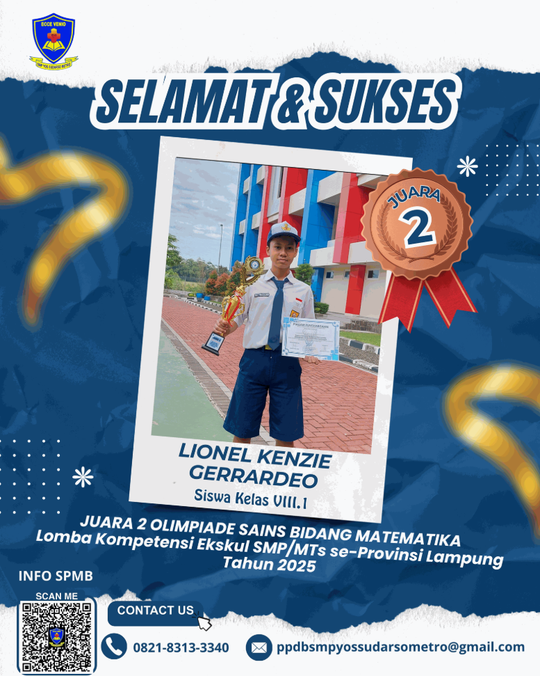 Siswi atas nama Dea berhasil menyabet Juara 2 Festival Lomba Seni dan Sastra Siswa Nasional (FLS3N) cabang lomba Menyanyi Solo Putri tingkat Kota Metro tahun 2025. Prestasi Gemilang!! Semoga akan selalu memberikan motivasi bagi seluruh siswa dan siswi SMP Yos Sudarso Metro